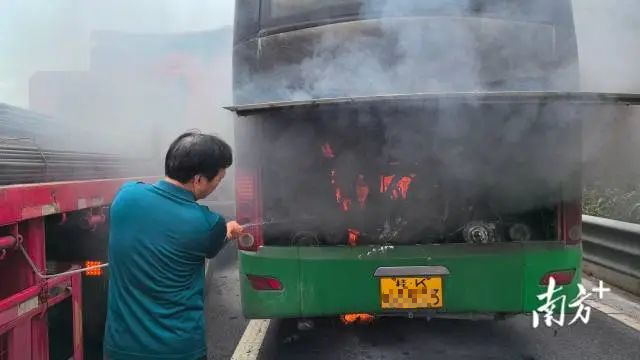 “若不及时处置,可能引发重大伤亡。”李建立即加速靠近大客车,通过鸣笛、打双闪的方式,引导司机将车平稳停入应急车道。此时,浓烟已笼罩半个车身,情况危急。