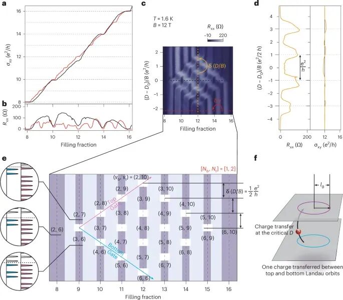 团队以[Nb,Nt]=[1,2]棋盘为例探究物理起源。解耦层间模型修正位移场后,发现所有朗道能级交叉处的电阻态在(D-D0)/B轴上都位于量子化值处,单位是e²/(2h)(图2a–d)。理论分析显示,固定总填充因子ν时,系统状态随D变化会发生相变,相邻相边界之间的临界位移场差δD/B量子化为e²/h。这一机制源于每个朗道轨道上电荷的整数化转移,且和母索引[NbNt]无关。图2e用图示展示了[12]棋盘及其中的相边界,图2f通过简化电荷转移模型说明了δD/B=e²/h的关系。
