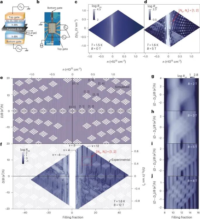 研究团队用机械剥离法制备单层石墨烯和六方氮化硼薄片,通过干法转移堆叠成扭转角20°或30°的双层石墨烯,再用上下h-BN封装,器件采用双栅极结构,栅极与电极为Ti/Au(图1a)。图1b是典型器件(Sample-S15,30°扭转)的光学显微图。零磁场下,D-n空间中样品沿电荷中性线(n=0)的纵向电阻Rxx随D偏离零而降低,体现出弱层间耦合特性,和传统强耦合伯纳尔堆叠双层石墨烯行为不同(图1c)。B=5T磁场下,D-n空间里电子和空穴侧每个朗道能级交叉处出现电阻态(圆点状),且点的大小分布不均(图1d)。磁场进一步增强,自旋与谷简并逐步解除,这些单点慢慢变成均匀的4×4矩阵状棋盘图案(图1e–f)。图1g–j展示了另一器件(Sample-S37,20°扭转)在[Nb,Nt]=[1,2]区域从2T到8T磁场下,单点向4×4棋盘结构的演化过程。