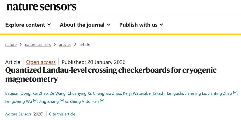 针对这一情况,山西大学韩拯教授、张靖院士,武汉大学吴冯成教授,中国计量院赵建亭教授团队合作,在大扭转角(20°–30°)双层石墨烯里发现了一个全新的量子化量——位移场与磁场的比值D/B。高磁场下,上下两层石墨烯的朗道能级会交叉,在D/B-ν参数空间中形成大小均匀的棋盘图案。这些图案来自垂直电场驱动下,每个磁通量子对应一个基本电荷的层间转移,使得临界位移间隔呈现量子化:δD=e²π(lB为磁长度)。这种机制为磁传感提供了新方向,因为D/B只由基本物理常数决定。相关成果发表在《Nature Sensors》上,同期该期刊还为此发表了news&views评论。