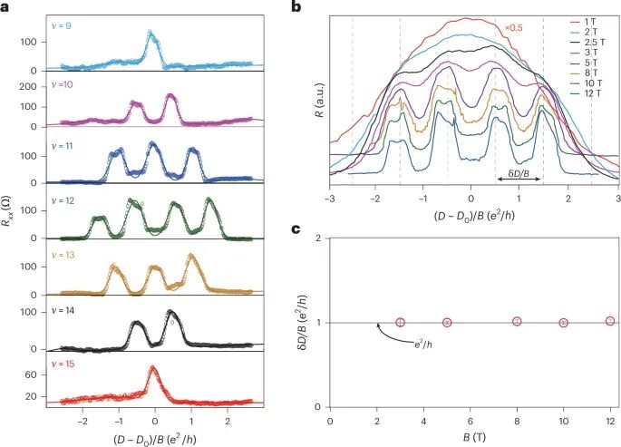 固定ν时,团队研究了棋盘内D/B量子化对磁场B和温度T的依赖关系。图3a是Sample-S37在12T和1.6K下ν=9至15的Rxx线剖面,通过高斯拟合提取峰值位置。图3b显示约3T以上时,ν=12处的单峰逐渐变成清晰的四峰结构。图3c统计了不同磁场下δD/B的值,其围绕e²/h分布,和理论预期一致。