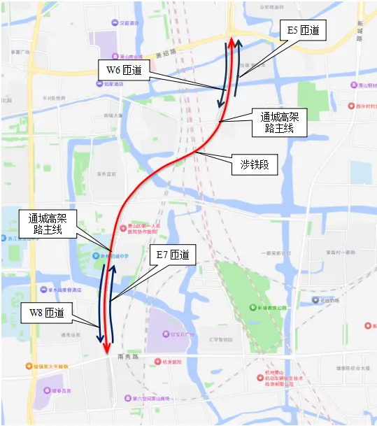 本次开通路段包括通城高架路萧绍路至南秀路段主线,以及配套的E5、W6、E7、W8四条上下匝道。同时,拱秀路(商城南路-滨水路)和商城南路地面道路(拱秀路-新螺路)也同步实现临时保通。其中,E5、W6匝道位于萧绍路南侧,E7、W8匝道位于南秀路北侧,均为平行上下匝道设计。