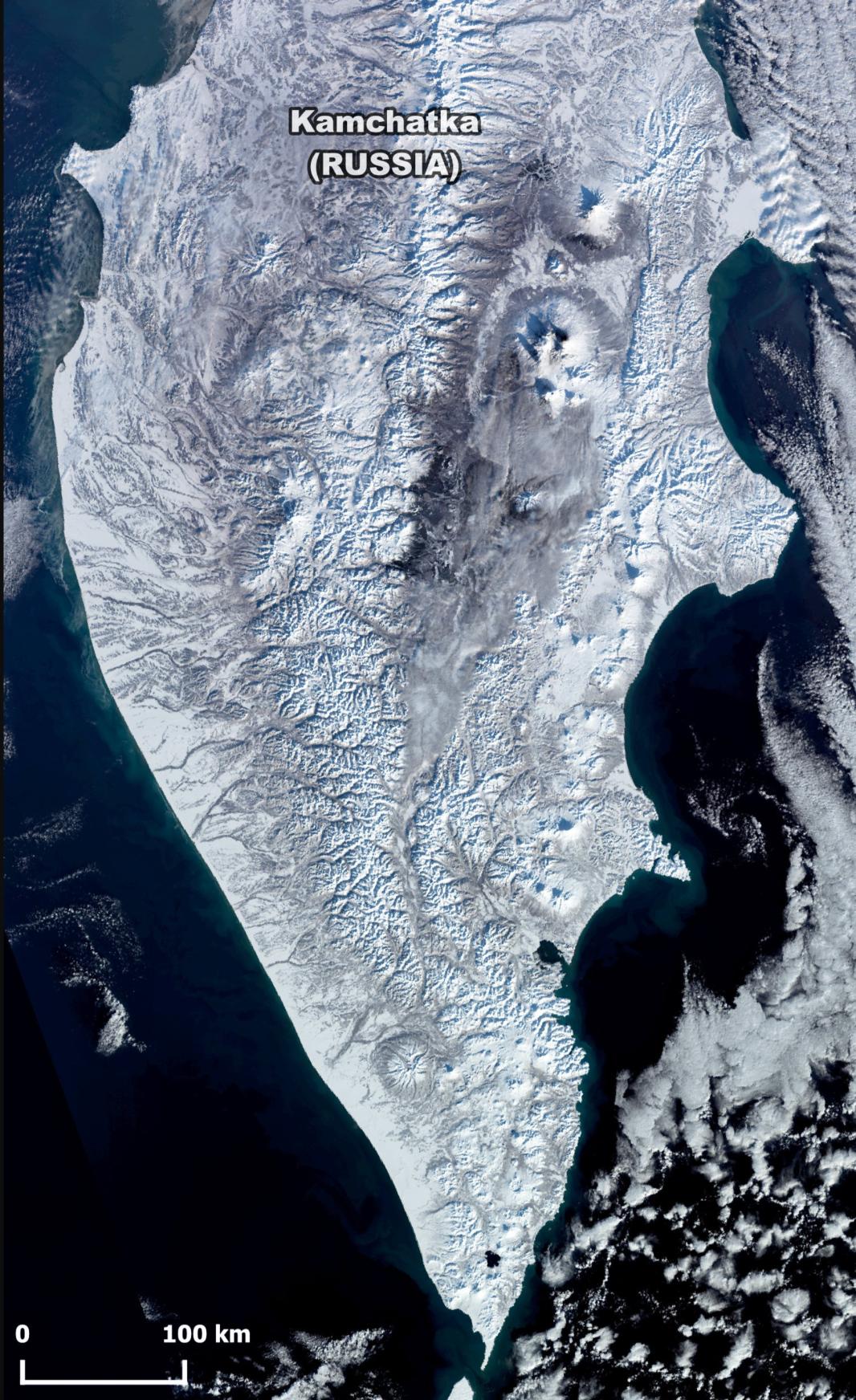 1月17日,卫星视角下的堪察加半岛被白雪覆盖。