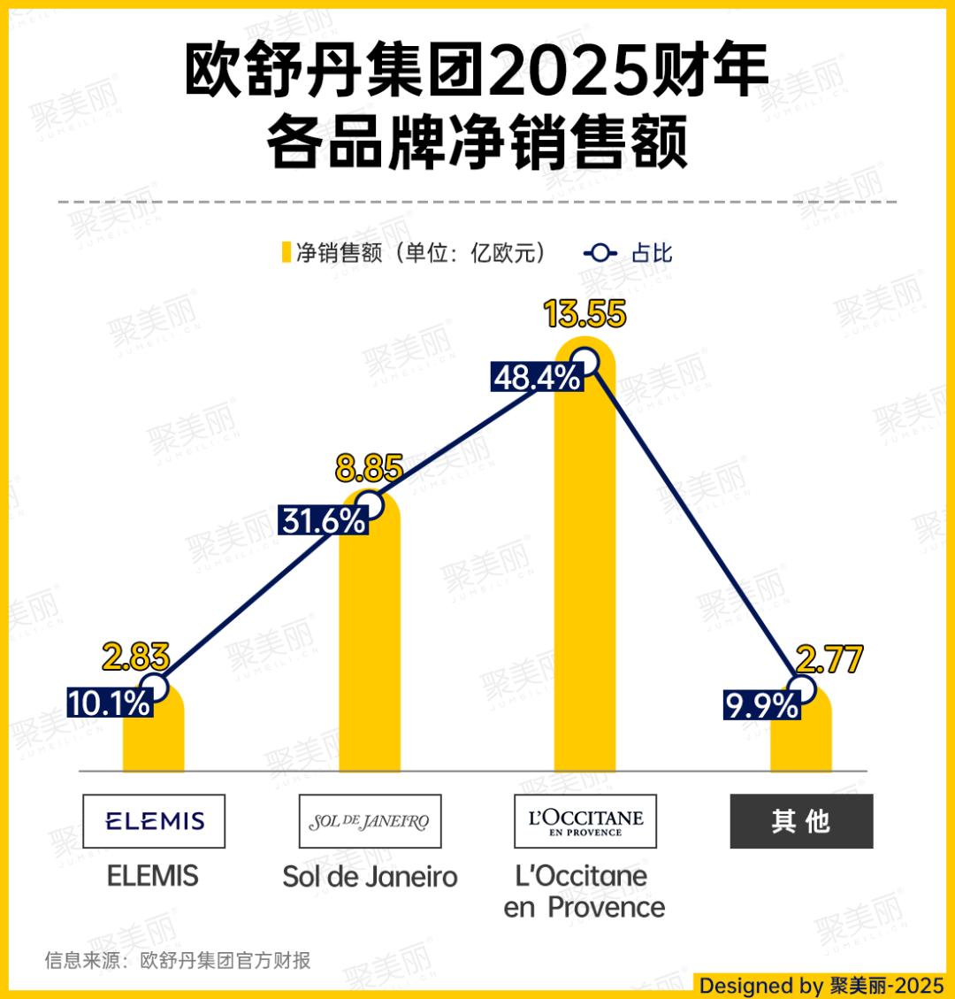 财报显示,2025财年集团旗下第一大品牌仍为欧舒丹,占净销售额48.4%,Sol de Janeiro、ELEMIS则稳步成长为第二、三大品牌,营收占比分别达31.6%与10.1%。