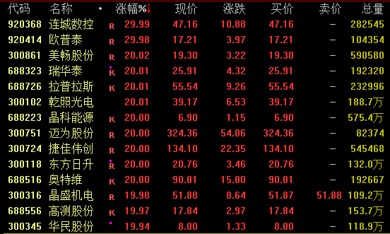 受太空光伏概念带动,整个光伏产业链股集体飙升,个股掀起涨停潮。截至收盘,连城数控、欧普泰30%涨停,迈为股份、捷佳伟创、拉普拉斯、奥特维等十多只个股20%涨停,帝科股份涨幅约19%,隆基绿能、钧达股份、亚玛顿等十余只个股10%涨停。