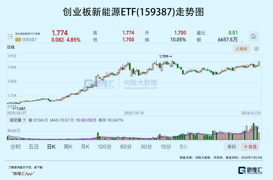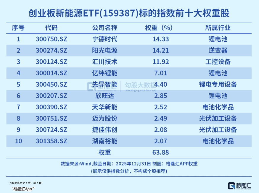 创业板新能源ETF(159387)跟踪创业板新能源指数,标的指数覆盖锂电池、逆变器、电池化学品、工控设备、锂电专用设备、光伏加工设备等产业链上中下游,固态电池+储能占比超65% ,权重股包括宁德时代、阳光电源、汇川技术等行业龙头公司。同时因为聚焦创业板,涨跌幅限制为20CM,相比主板个股涨幅更具弹性。