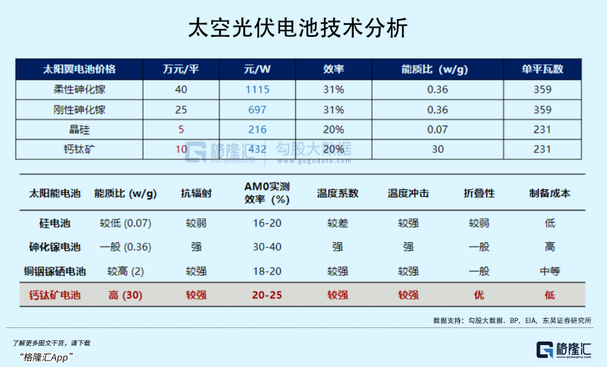 此前,太空光伏主要使用砷化镓(GaAs)电池,虽然效率超过30%且抗辐射能力强,但由于制造工艺复杂、良率低,再加上需要镓、铟等稀有金属原材料,每平米数十万元的高昂成本限制了其大规模应用。
