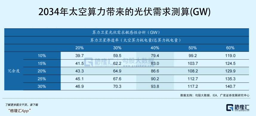 若以渗透率(太空算力耗电量/总算力耗电量)和冗余度(卫星其他部件的能源损耗)为变量进行敏感性分析,在渗透率40%、冗余度20%的中性预期下,预估到2034年算力卫星带来的光伏需求将达到86.6GW。后续若渗透率持续提高,需求有望超过100GW。