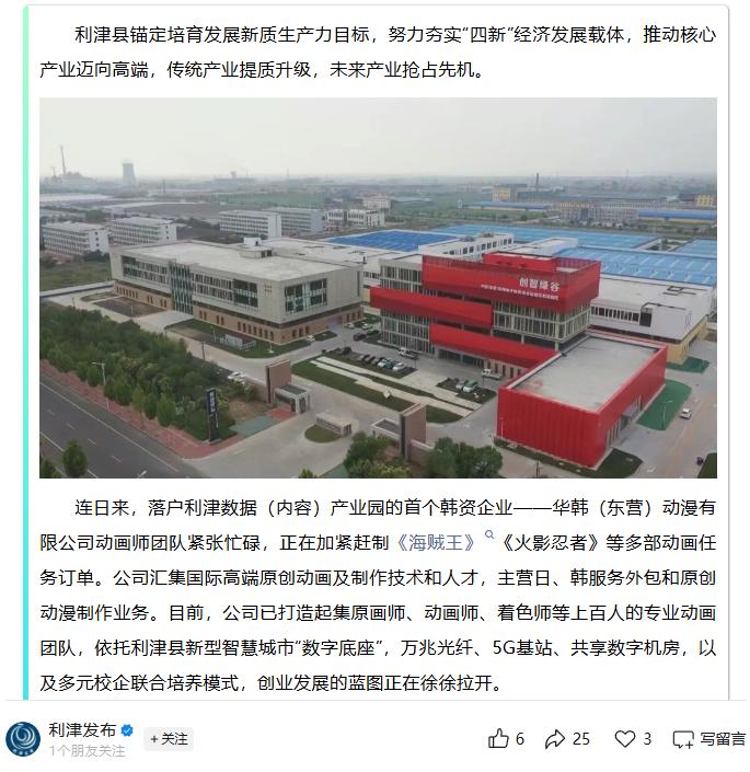 日前,利津县人民政府官方公众号“利津发布”推送了一篇题为《融媒记者行 | 百人动漫团队绘制海外订单》的文章,文中提到: