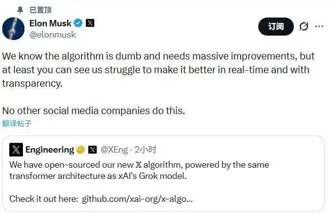 北京时间1月11日,马斯克曾表示“七天后开源算法”,当时多数人以为这只是又一次“画饼”。毕竟近几个月,X.com平台风波不断,裁员、AI生成争议内容、与监管机构摩擦等问题频发。