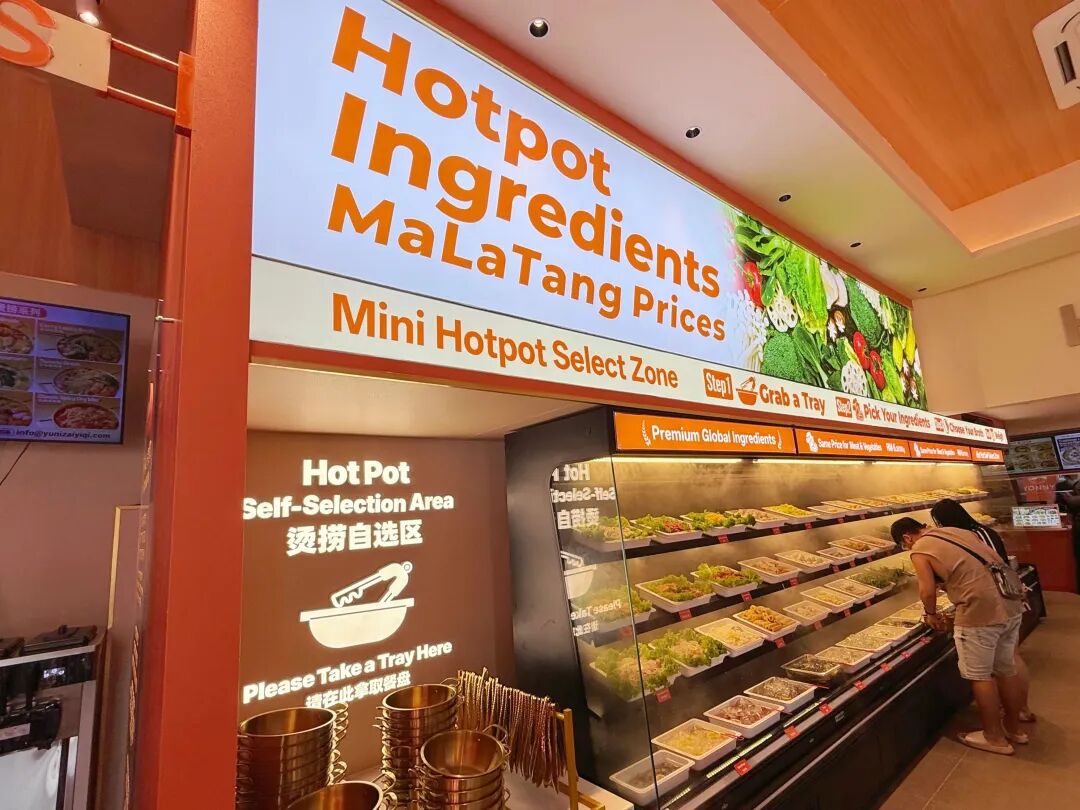 这种模式类似麻辣烫自选形式,消费者可自取小锅夹子,在展示区自由搭配近百种食材与汤底,按重量计价:海鲜肉类6.98元/50g,丸子素菜2.98元/50g。汤底涵盖草本骨汤、番茄汤等经典款,以及新加坡叻沙、泰国冬阴功等国际风味,共约7种选择。