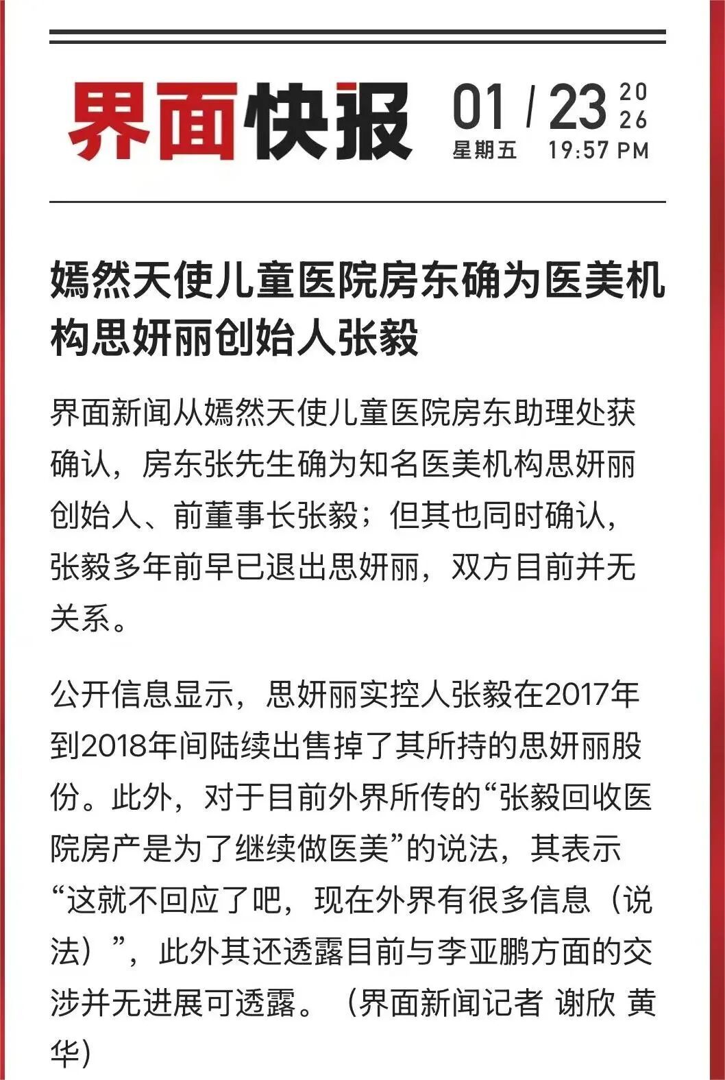 李亚鹏及其创办的嫣然天使儿童医院因房租问题面临强制腾退,此事引发社会广泛关注与爱心接力。此前关于逆势涨租的房东信息仅提及姓张、为香港人且年事已高,如今界面新闻最新报道揭开了房东的神秘面纱——他正是曾经的高端医美巨头思妍丽创始人、前董事长张毅。