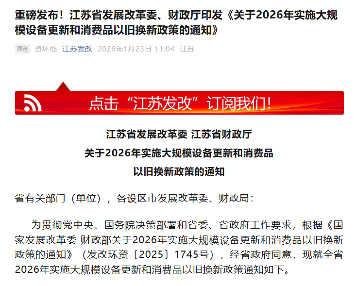 江苏省发展改革委与江苏省财政厅联合印发《关于2026年实施大规模设备更新和消费品以旧换新政策的通知》,确定2026年将持续推进大规模设备更新工作,并优化实施消费品以旧换新政策。