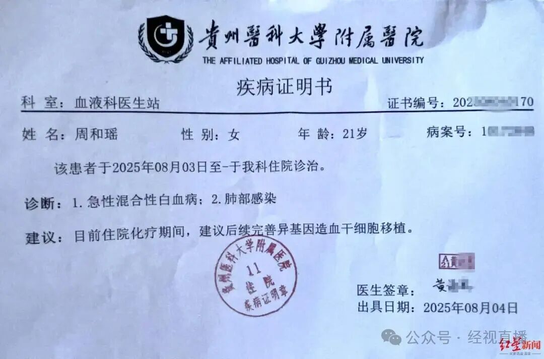 贵州医科大学血液内科黄医生证实,周和瑶患急性混合细胞白血病且有高危基因突变,化疗缓解后复发未完全缓解,急需造血干细胞移植。中华骨髓库配型存在不确定性,亲缘关系配型成功率更高。