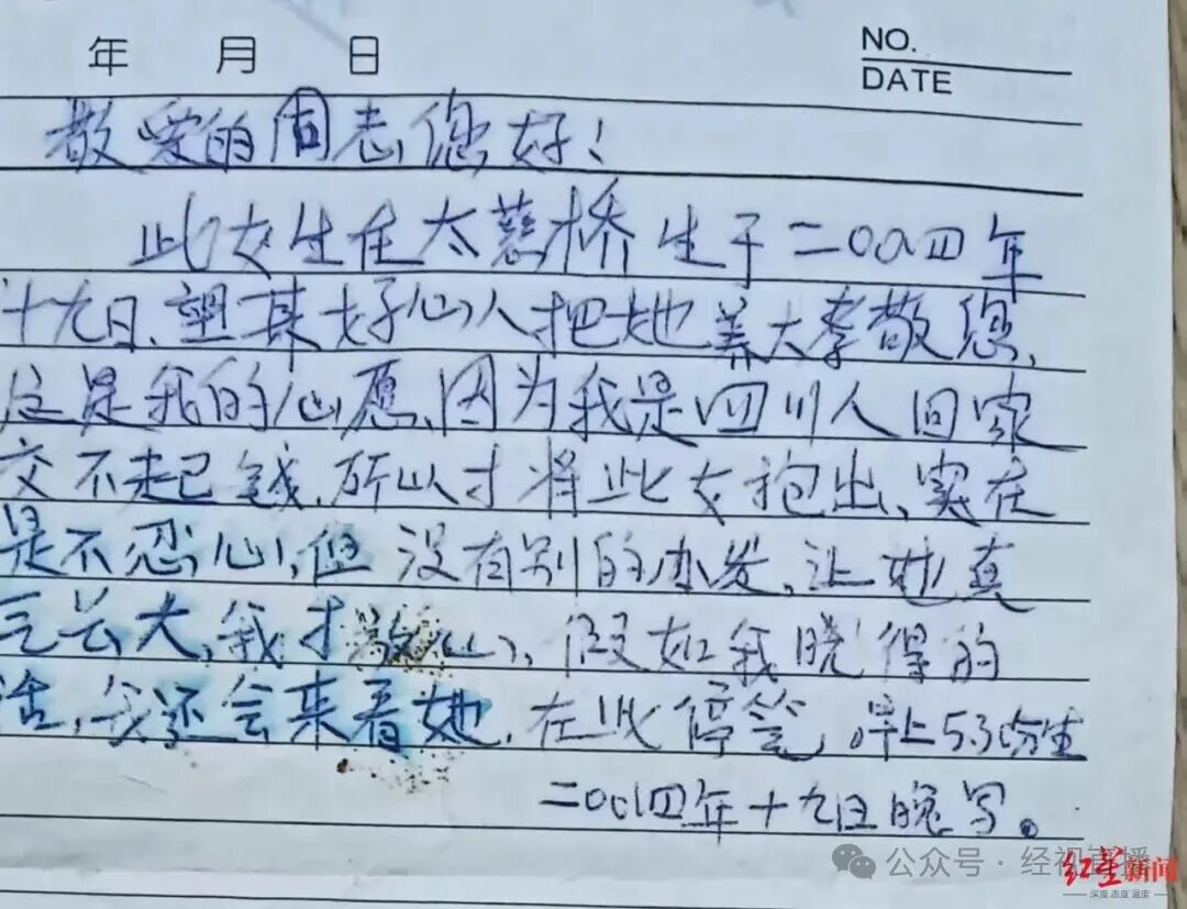 那张字条是唯一寻亲线索,内容写道:“此女生在太慈桥,生于2004年(月份未写)十九日,望某好心人把她养大孝敬您,这是我的心愿。因为我是四川人,回家交不起钱,所以才将此女抱出,实在是不忍心,但没有别的办发(法),让她真(争)气长大,我才放心。假如我晓得的话,我还会来看她。在此停笔,早上5:30生。”
