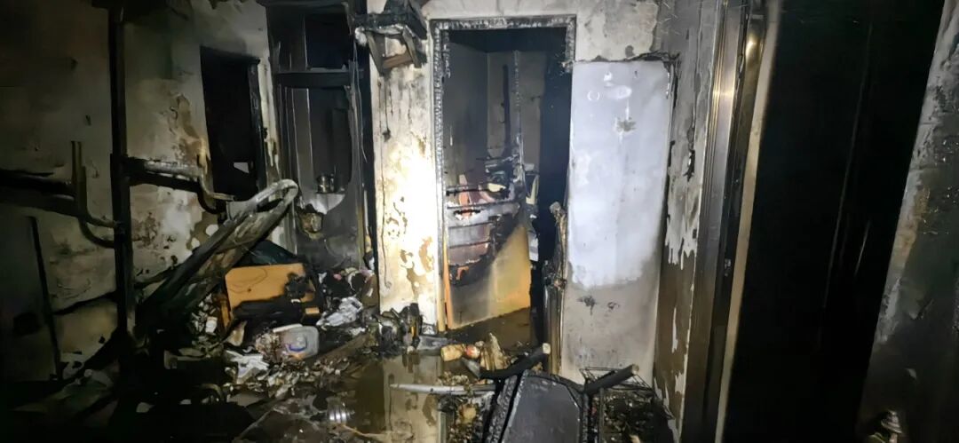 火灾过后,现场一片狼藉:起火点的餐桌及周边物品几乎烧毁,墙壁和地面被大面积熏黑。目前,火灾原因仍在进一步调查中。