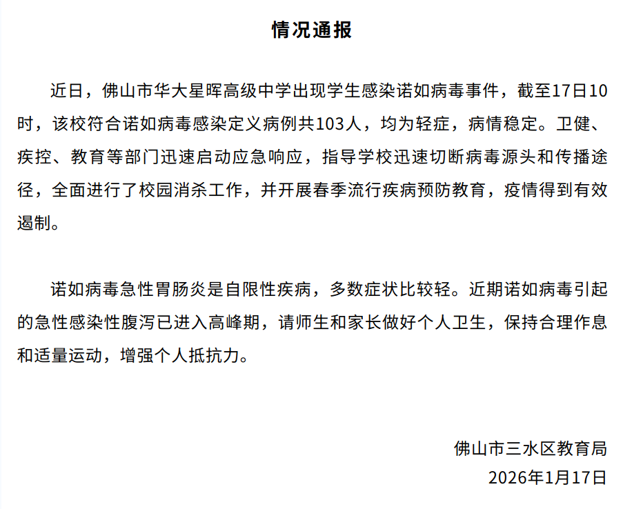 当前诺如病毒正处于高发期!1月17日下午,佛山市三水区教育局发布通报:佛山市华大星晖高级中学出现学生感染诺如病毒事件,截至17日10时,该校符合诺如病毒感染定义的病例共103人,均为轻症,病情稳定。卫健、疾控、教育等部门迅速启动应急响应,指导学校切断病毒源头与传播途径,完成校园全面消杀,并开展春季流行疾病预防教育,疫情已得到有效遏制。