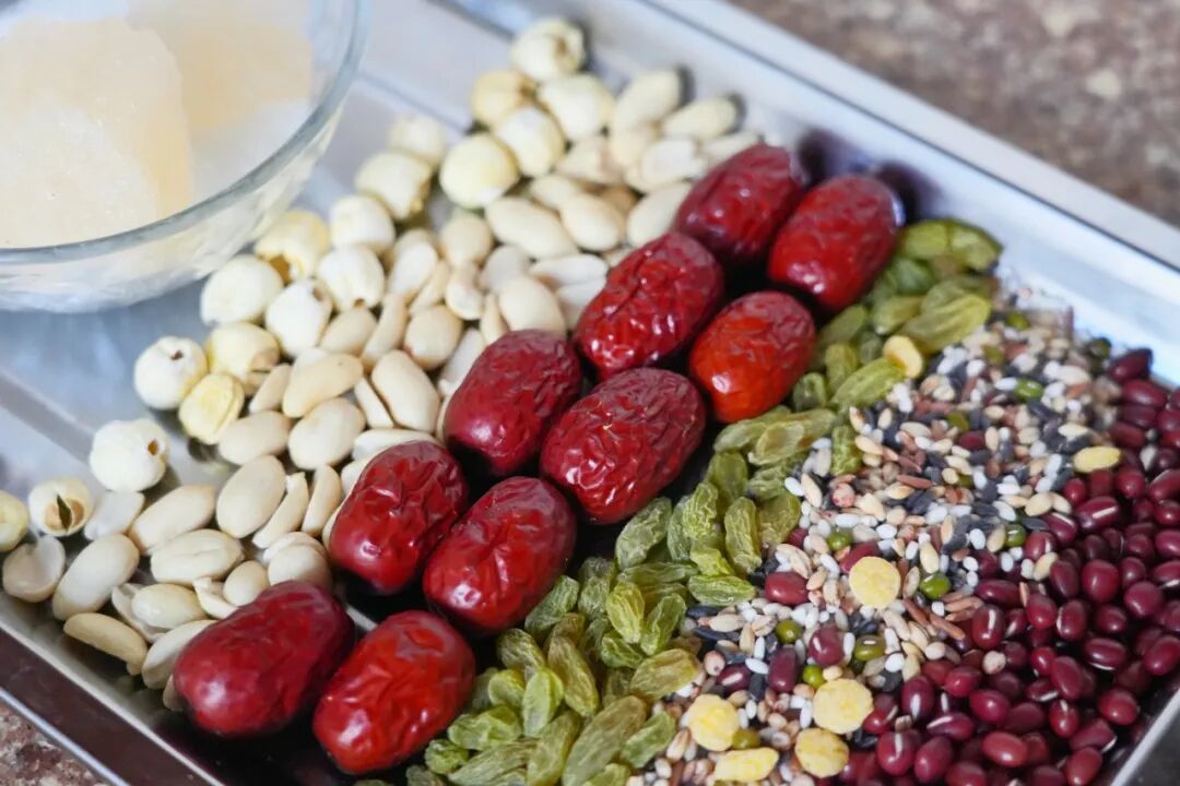 传统腊八粥的食材清单中,总少不了这些经典搭配:红豆、花生、红枣、莲子、葡萄干、黑米、薏米、绿豆、大米。这些看似平常的家常食材,挑选起来却颇有讲究。王阿婆告诉记者,红豆要提前一晚浸泡,花生得选颗粒饱满的,红枣要挑肉厚核小的。