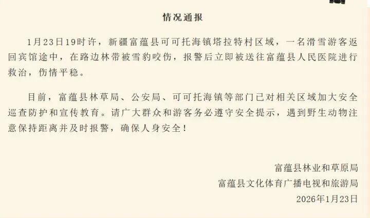 通报内容显示,1月23日19时左右,在新疆富蕴县可可托海镇塔拉特村区域,一名滑雪游客在返回宾馆的途中,于路边林带遭到雪豹咬伤。接到报警后,该游客被迅速送往富蕴县人民医院接受救治,目前伤情稳定。