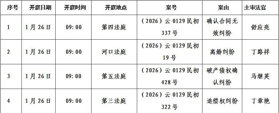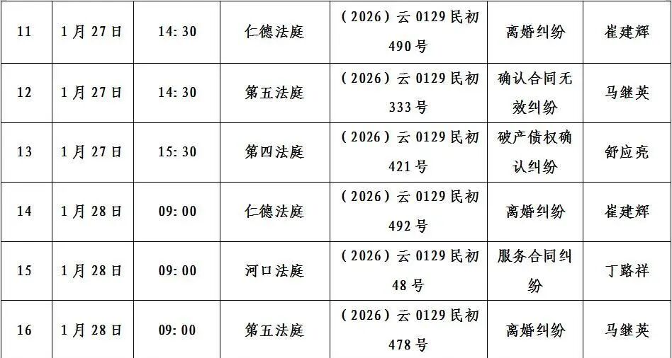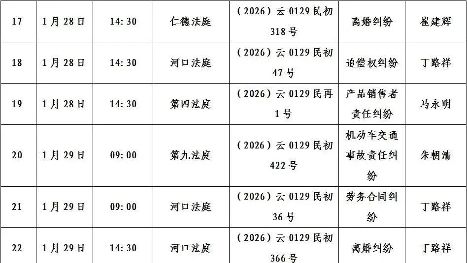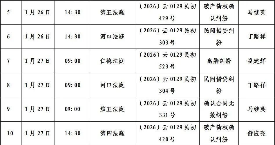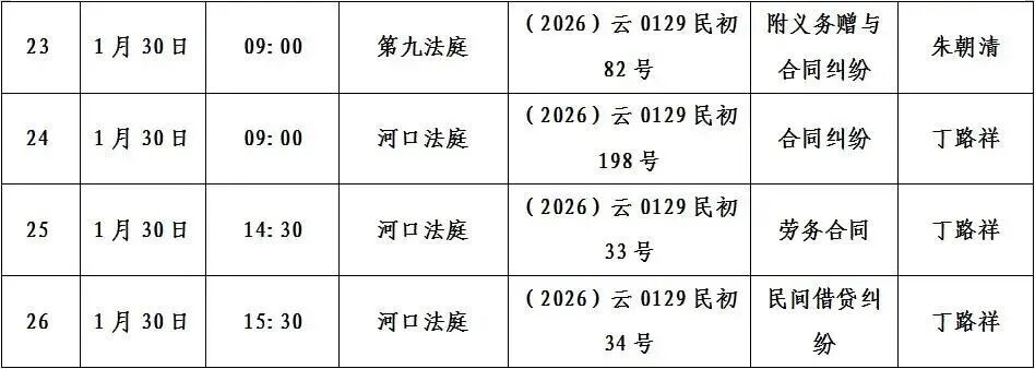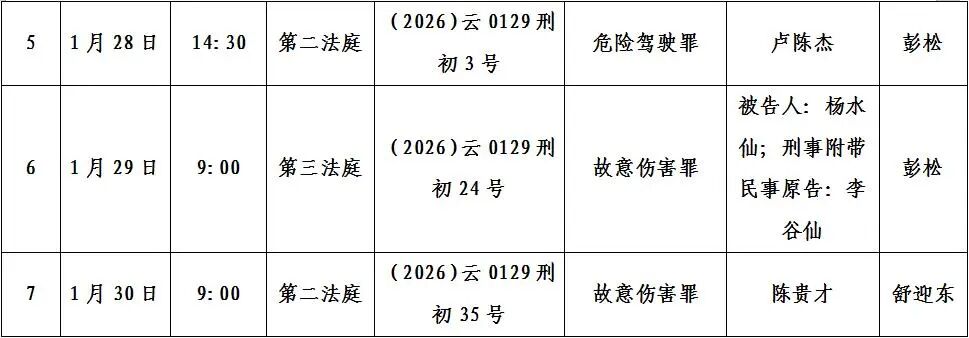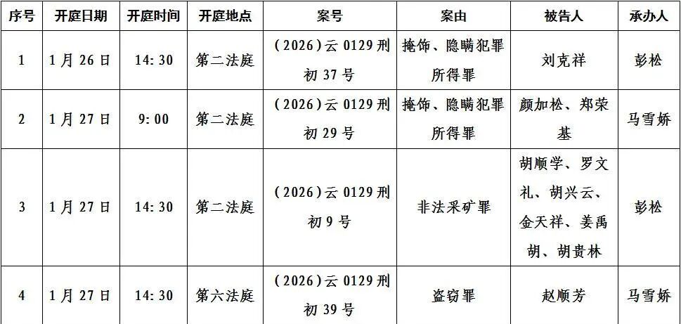 寻甸县人民法院2026年1月26日至30日开庭排期公告