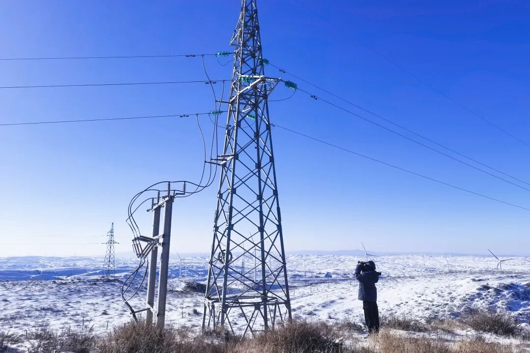 巡线人顶风冒雪,踏冰穿梭于风机铁塔间,以脚步丈量安全防线,护航电流跨越山海,续写雪原上的温暖守护。