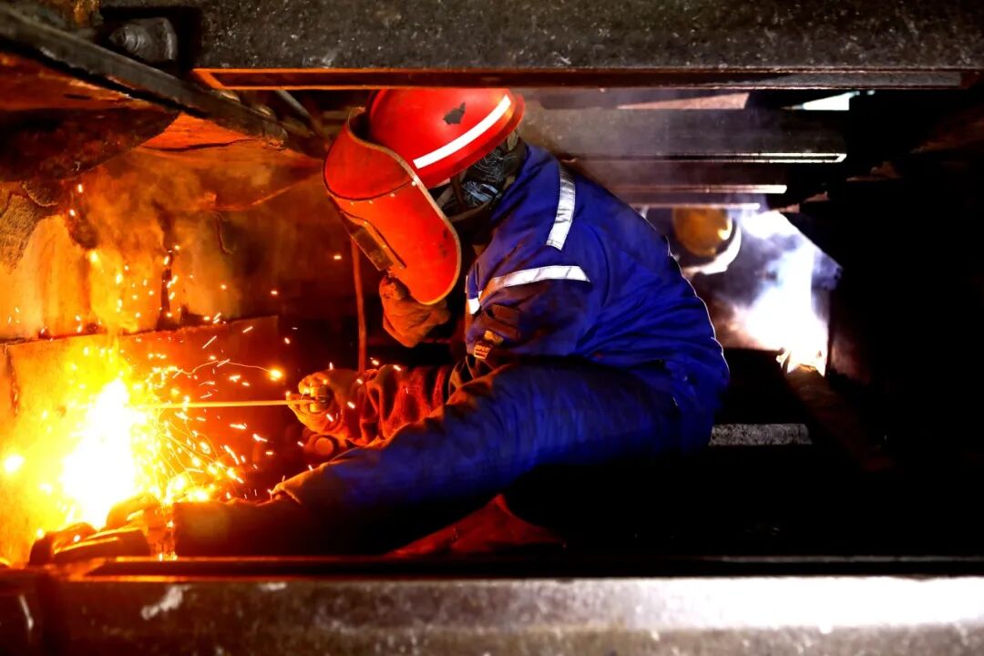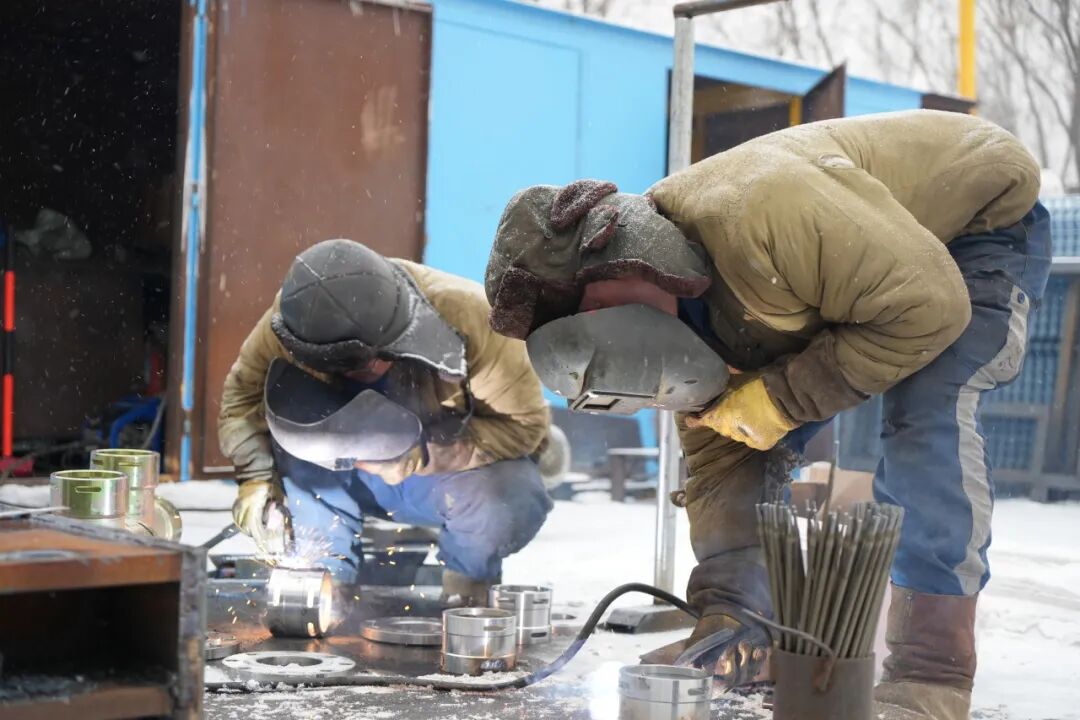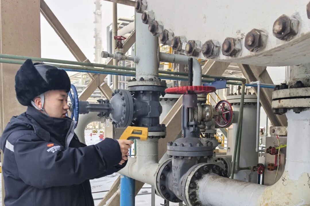 新疆极寒天气中,一线职工裹紧防寒服在设备间隙作业,焊花弧光是寒夜里最坚实的守护。