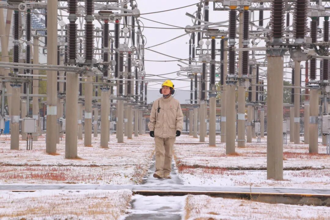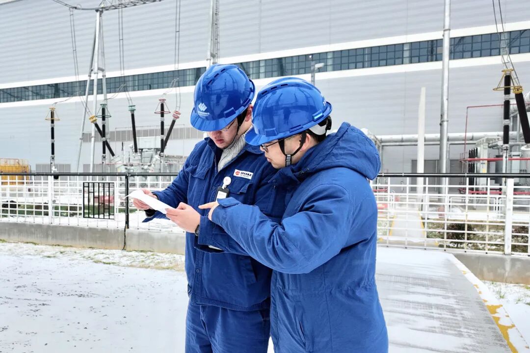 初雪覆盖升压站,安徽公司巡检员踏雪排查低温设备状态,守护设备安全。