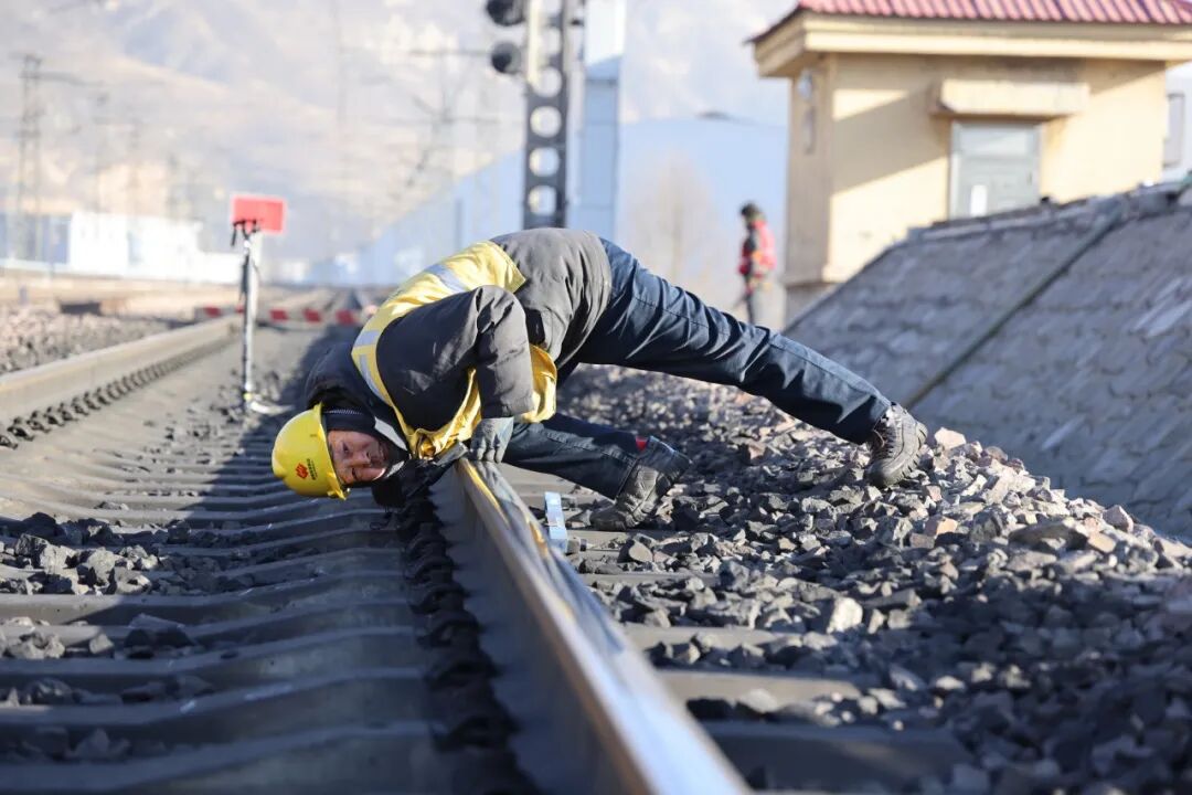 新朔铁路工务人呵气成霜中细致作业,确保列车通行安全。