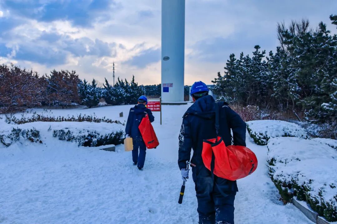 国华投资山东分公司新能源铁军顶风踏雪排查故障,保障风机高效发电,筑起寒冬能源防线。