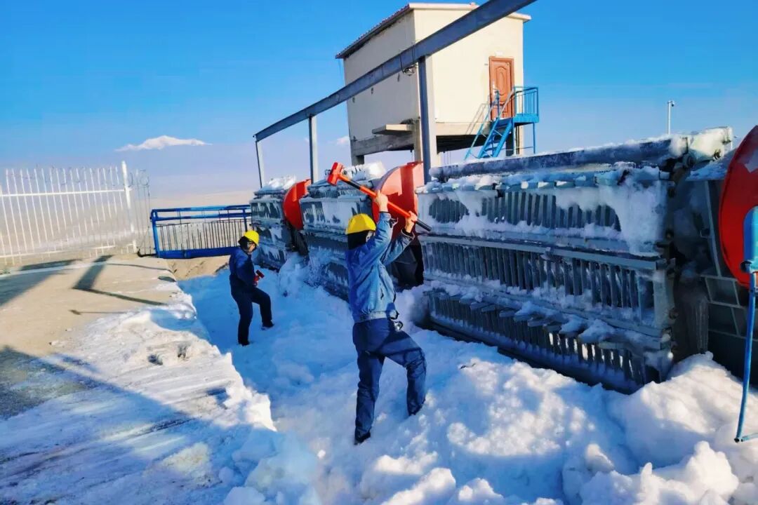 新疆电力水工人员清除拦污栅冰棱,确保设备安全运行。