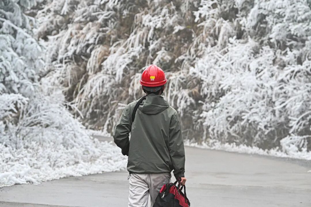 广西桂林-3℃低温下,运检员徒步巡视覆冰设备,以坚守守护设备平稳运行。