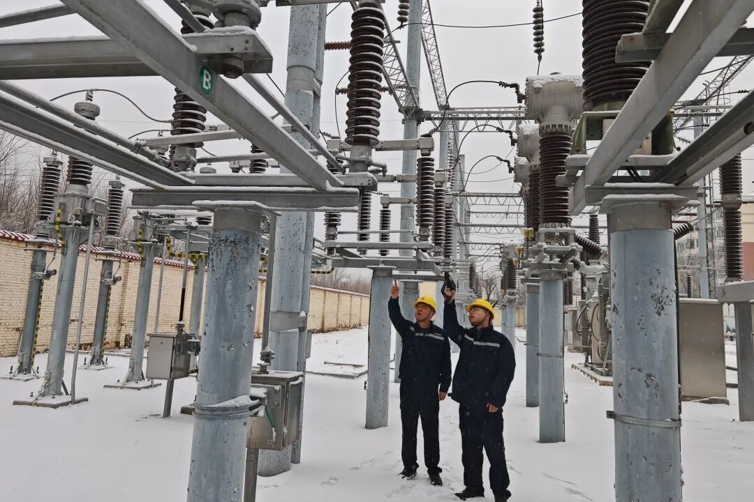 雪后变电站,准能集团供电公司值班员手持检测仪加密检查设备,银装素裹中,以暖行守护电网安全。