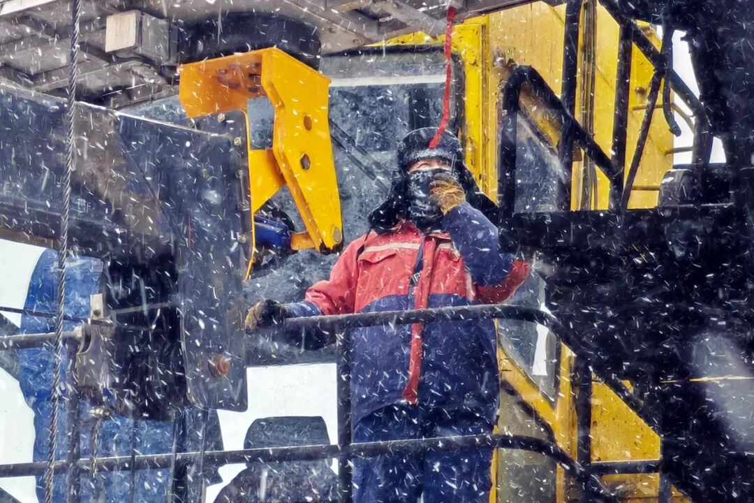 电铲维修工指挥吊车更换零部件,红蓝身影成风雪中温暖坐标,肩头雪花诉说着精准与专注。