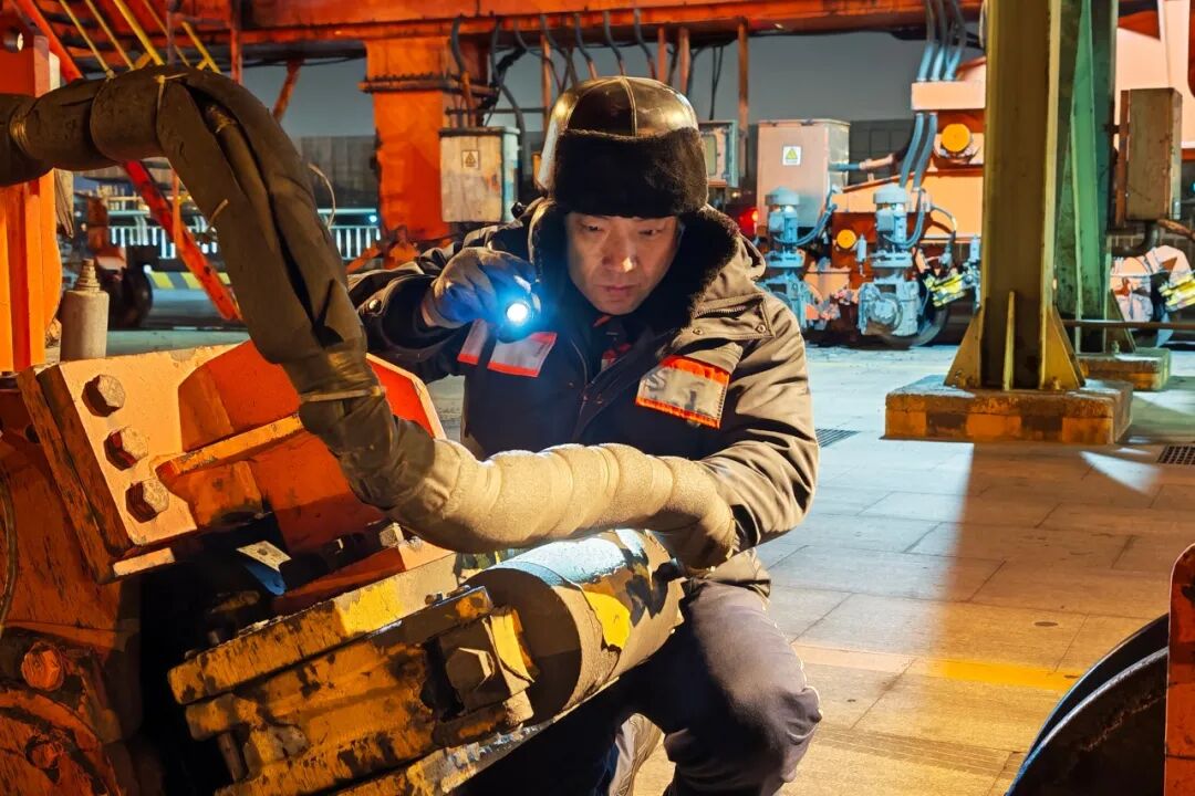 黄骅港务点检员寒夜中仔细核查设备安全措施,手电光亮添暖意更守安全。