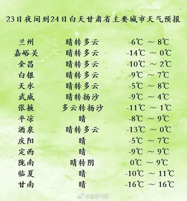 据甘肃气象部门最新预报,1月24日至25日,省内将出现大风、沙尘、降温及弱降水天气。建议公众提前做好准备,及时调整出行计划。
