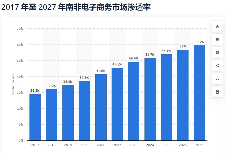 南非新中产追求个性、高端、小众产品,传统商贸无法满足这一需求。从几年前开始,创二代接过父辈的接力棒,在南非市场续写暴富传说。2012年,国内电商蓬勃发展时,就有中国老板在南非涉足电商。何顺杰刚毕业便到南非做电商,当时南非电商尚处起步阶段,他主打服饰、家具、母婴三个垂直品类,通过谷歌投放广告,日销售额达二三十万。近10年南非电商发展迅速,Statista报告显示,2024年南非电商渗透率居非洲之首,预计2027年将达59.7%。
