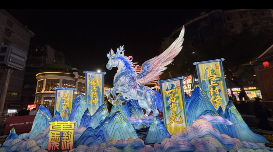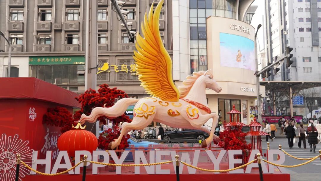 中山路天虹商场门口,大型飞马花灯栩栩如生,成了市民进店前的必拍景观。商场内的服装专柜早已把马元素新款摆上C位,备受青睐。家长们忙着为孩子挑选新年穿搭,盼着讨个好彩头。