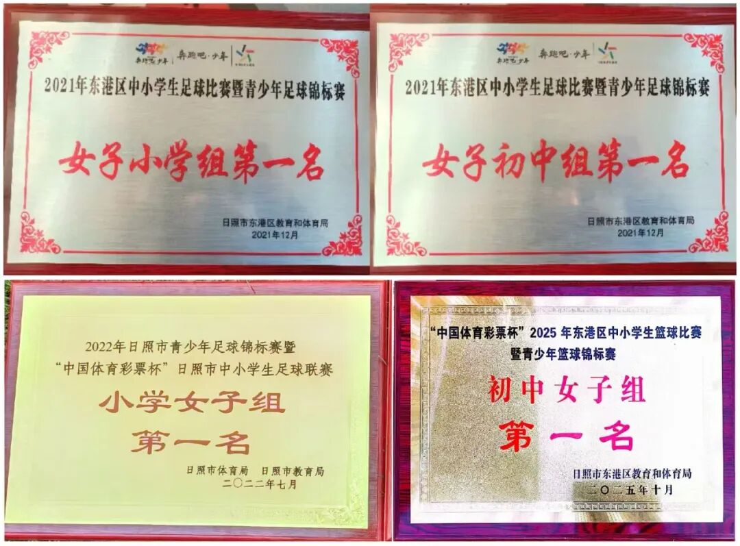 汗水浇灌梦想,拼搏铸就辉煌。2024年以来,学校的篮足小将们捷报频传:足球方面斩获东港区中小学生足球比赛小学女足甲组冠军、初中女足冠军;篮球领域夺得东港区中小学生篮球比赛初中女篮冠军、日照市青少年篮球锦标赛初中女篮第一名(获体育道德风尚奖)、山东省中小学生体育联赛篮球比赛女子初中组第七名。