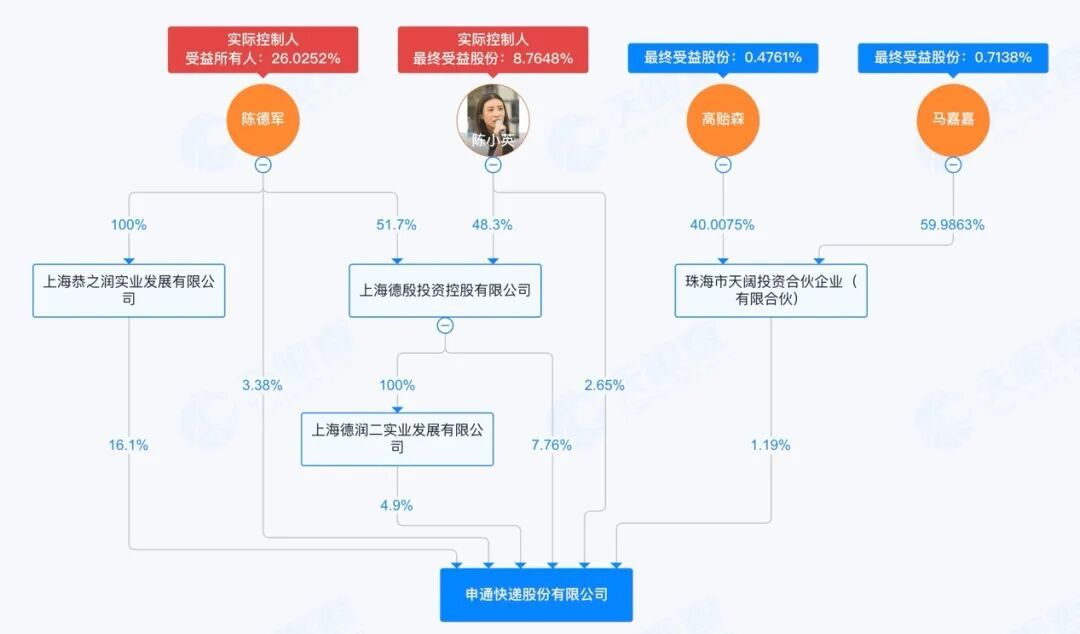 此外,陈小英还通过上海德殷投资控股有限公司和上海德润二实业发展有限公司间接持有申通快递6.11%的股份,合计持股比例为8.76%。陈德军直接、间接持股比例为26.03%。兄妹二人总计持股34.79%,是公司的实际控制人。