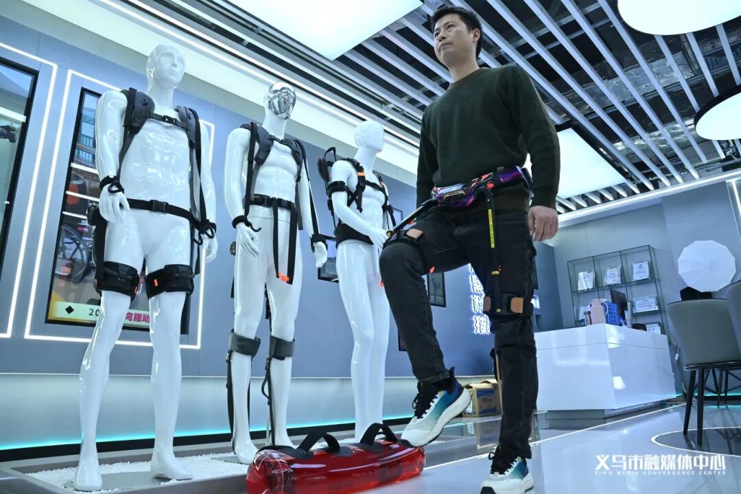 义乌全球数贸中心内,客商试穿外骨骼机器人科技装备。