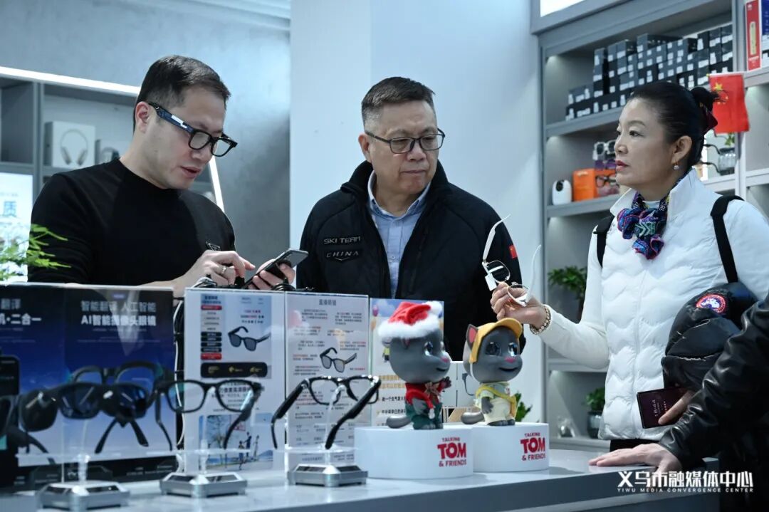 来自哈萨克斯坦的客商(右一、右二)试戴AI智能录像眼镜。