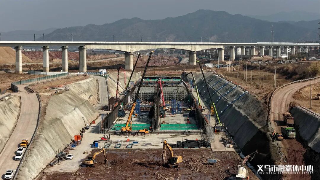 甬金高速公路改扩建工程涉双江湖路段土建工程隧道区域建设现场一片繁忙,运输车辆穿梭不停,钢筋工捆扎基坑钢筋,起重机吊装钢材,各项工作有序推进。目前,隧道区域2号、3号基坑已开挖完成,1号、4号、6号基坑正全面施工。双江湖新区的中国计量大学现代科技学院宿舍二期建设工地,多项施工同步进行,建设者们抢工期、赶进度,展现实干姿态。