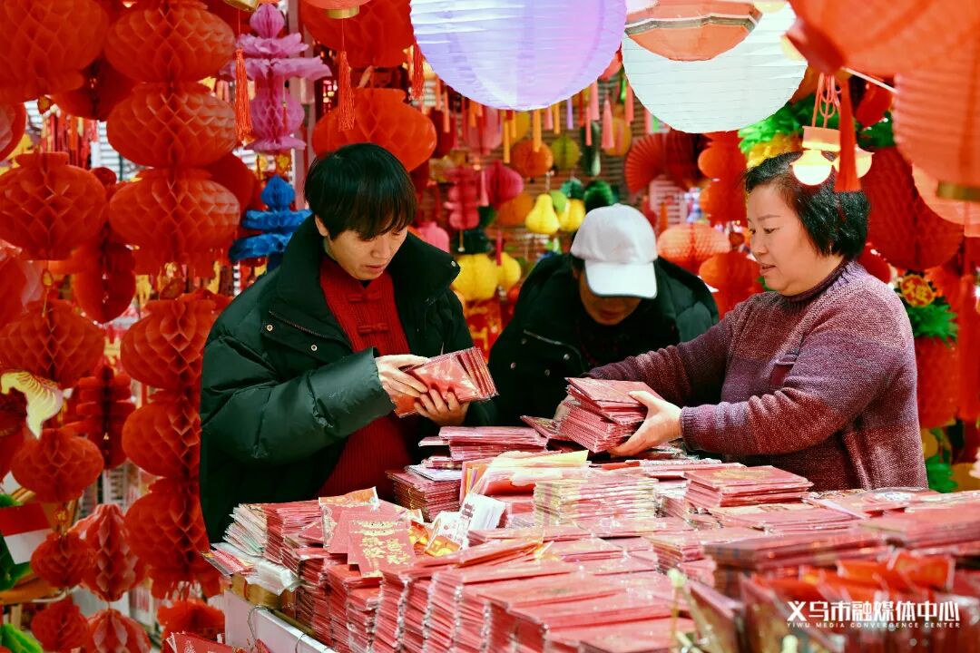 1月23日,义乌国际商贸城的喜庆用品专区迎来销售高峰,国内外客商络绎不绝,争相选购马年主题的节庆商品。随着农历新年临近,市场内的年货新品不断上架,这些新品巧妙融合传统春节元素,让马年节庆用品持续走俏。