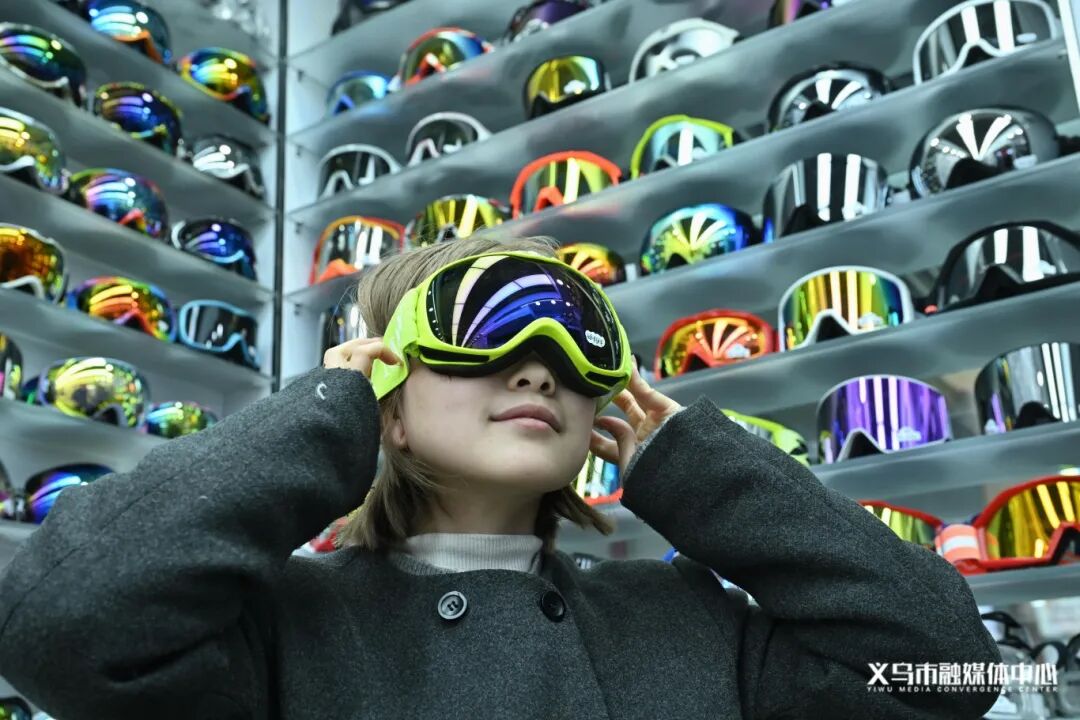 国际商贸城内,一位客商试戴滑雪护目镜。