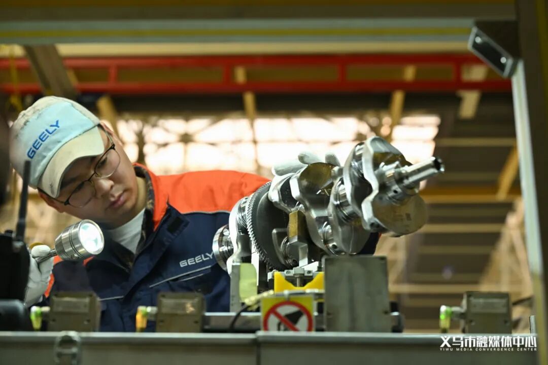 义乌吉利动力总成有限公司高端动力智能制造基地,技术检验人员检验发动机轴承部件。