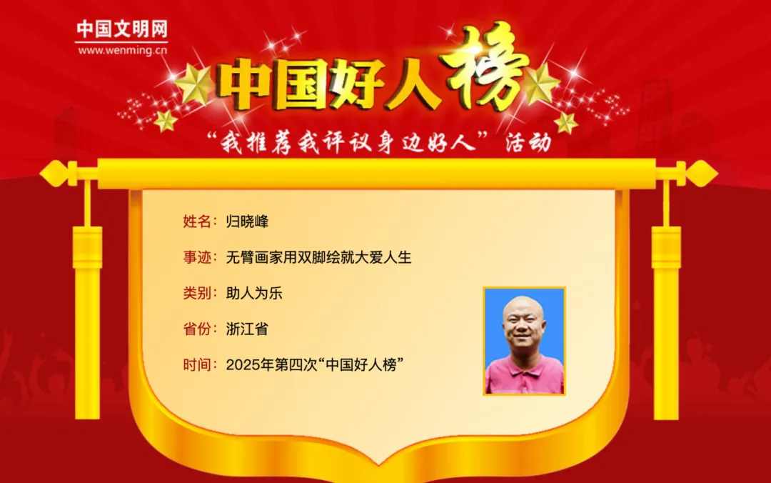 2025年第四次“中国好人榜”近期正式公布。经过各地推荐、网友评议以及专家评审等多个环节,共有139名在助人为乐、见义勇为、诚实守信、敬业奉献、孝老爱亲方面表现突出的身边好人光荣入选。其中,湖州市民归晓峰荣获助人为乐类“中国好人”称号。