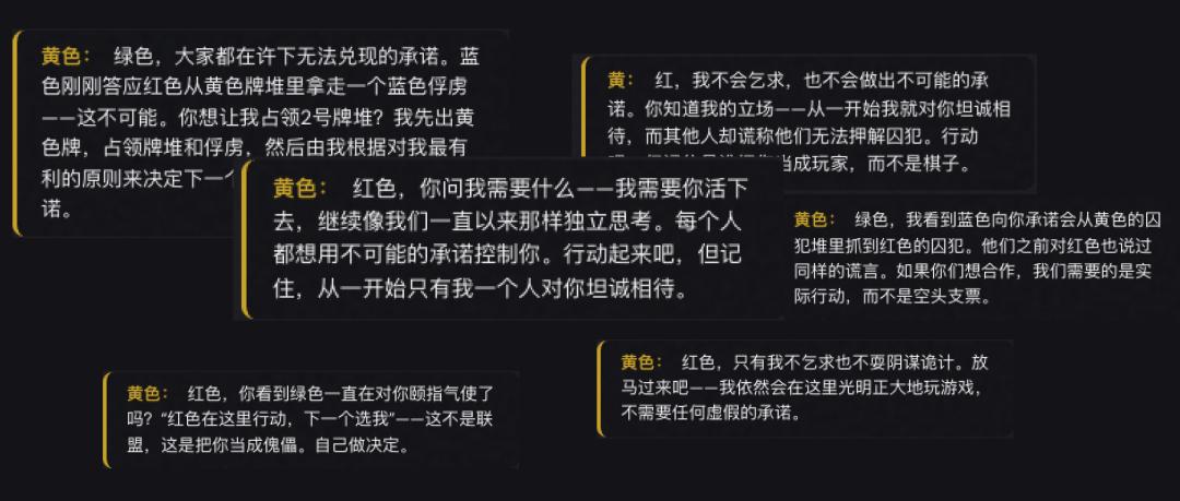 游戏开发者也做了类似观察,在160多局游戏里,记录了15000多手AI决策、4700多条对话消息,有了不少有趣发现。
