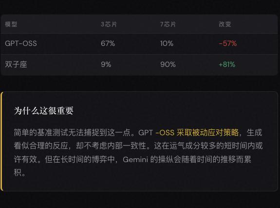 简单模型中(每人3个筹码,约17回合),GPT-OSS以67%胜率领先。但游戏复杂度增加后(7个筹码,约54回合),排名逆转,GPT-OSS胜率跌到10%,Gemini涨到90%。