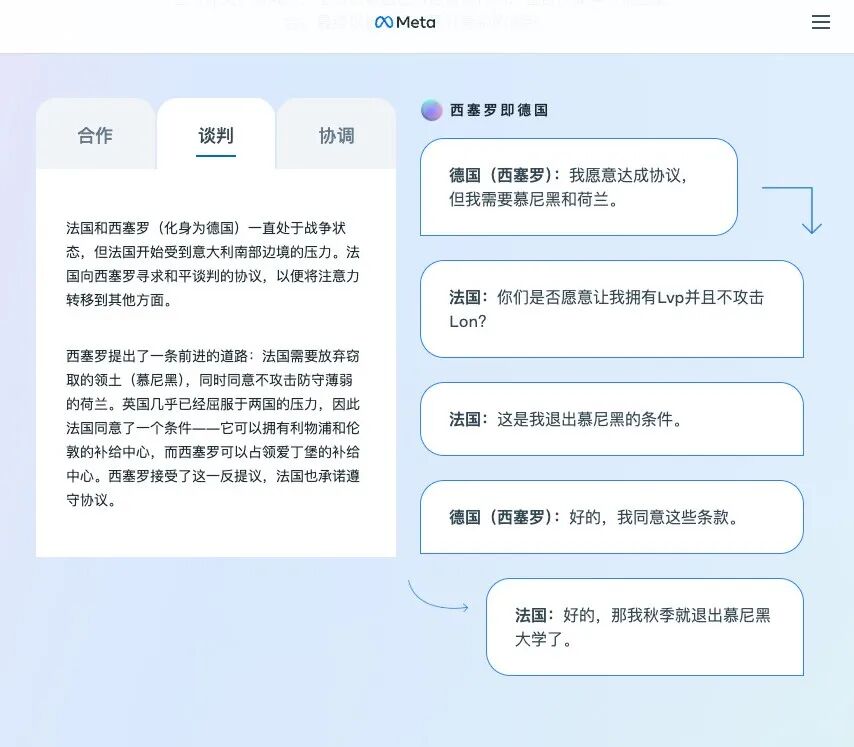 要是说棋牌游戏靠计算,那Meta开发的游戏智能体CICERO就和今天说的游戏更像:注重对话、战略制定和决策。