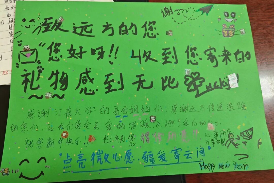 “谢谢江南大学的哥哥姐姐!”一声声清脆的感谢,一句句腼腆的“我很喜欢”,还有那些一字一句写下的回信,都成了这个冬天最珍贵的回礼。